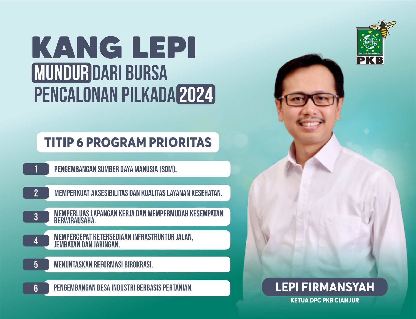 “Saya menyatakan mundur dan menarik diri dari bursa pencalonan bupati dan wakil bupati untuk Pilkada Cianjur 2024,” ucap Lepi dalam pernyataan di akun Instagram pribadinya.
